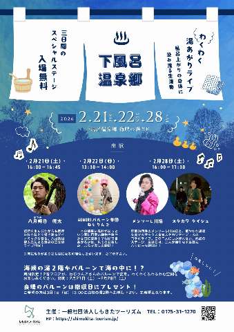 風間浦村下風呂温泉郷の「海峡の湯」2階で、「湯あがりライブ」を3日間にわけて開催!1日目は、八月朔日氏による三味線ライブ!2日目は、AOMORIバルーン集団ねじりんご氏による、バルーンショー!3日目はメンソーレ川端氏とサックス奏者スケカワ氏によるコラボライブ!ライブでは、各回先着30名様限定で手持ちのバルーンもご用意します。さらに期間限定で、海峡の湯2階をバルーン装飾します!皆さまぜひお越し下さい。