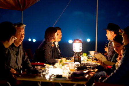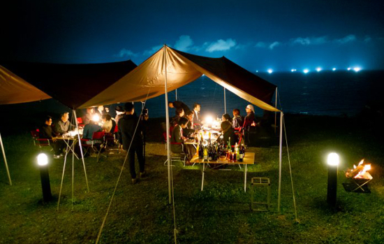 『東寿し』板長 柿本泰平氏率いるシェフチームが、「大間産本鮪」や「風間浦産雲丹」など、下北半島の食材をふんだんに使ったレシピを考案。漁火が見えるロケーションの中、コース仕立ての創作料理が提供されました。