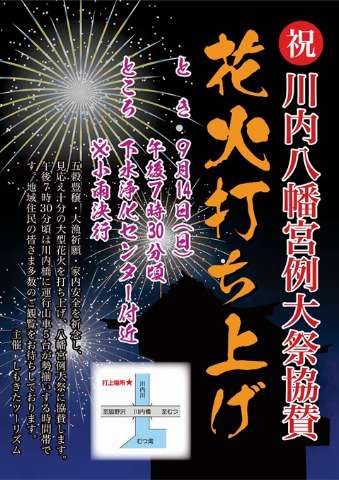 川内八幡宮例大祭に合わせ、花火打ち上げを行います! 川内橋に並ぶ山車5台の幻想的な灯りとともに上がる花火。是非お待ちしております✨