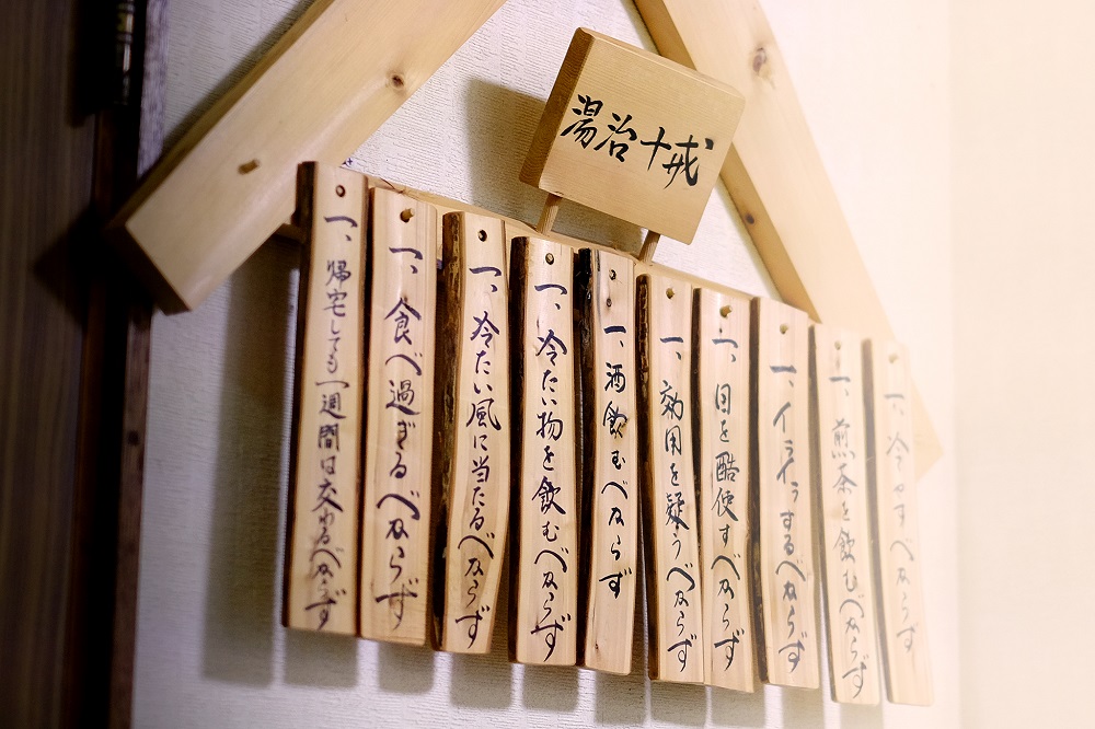 湯場に掲げてある「湯治十戒」、しゃんとして読み進めていくと、「帰宅しても一週間は交わるべからず」とある。ちょっとしたユーモアに心も緩む。