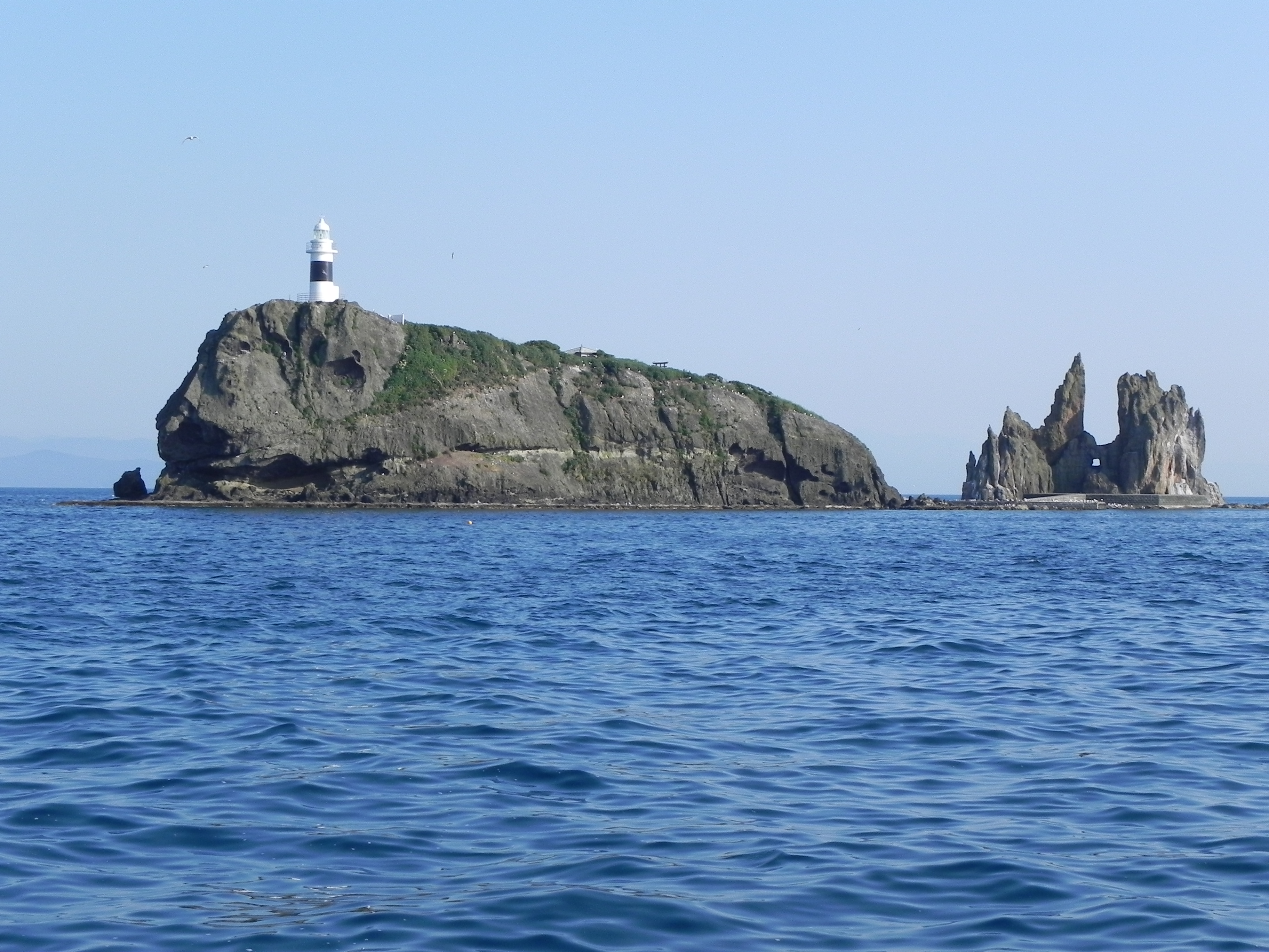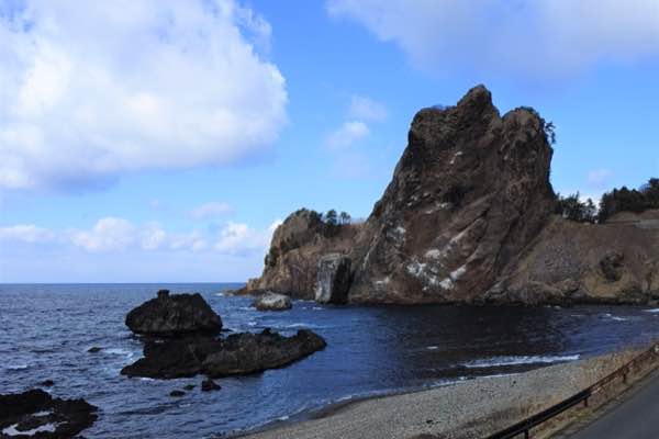 脇野沢の沖合に浮かぶユニークな形をした無人島